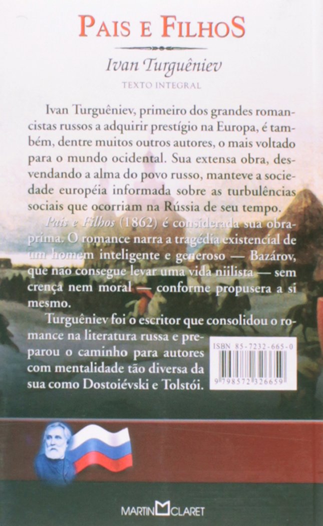 Ivan Turguêniev, primeiro dos grandes romancistas russos a adquirir prestígio na Europa, é também, dentre muitos outros autores, o mais voltado para o mundo ocidental. Sua extensa obra, desvendando a alma do povo russo, manteve a sociedade européia informada sobre as turbulências sociais que ocorriam na Rússia de seu tempo. 'Pais e Filhos' (1862) é considerada sua obra-prima. O romance narra a tragédia existencial de um homem inteligente e generoso - Bazárov, que não consegue levar uma vida niilista - sem crença nem moral - conforme propusera a si mesmo. Turguêniev foi o escritor que consolidou o romance na literatura russa e preparou o caminho para autores com mentalidade tão diversa da sua como Dostoiévski e Tolstói.